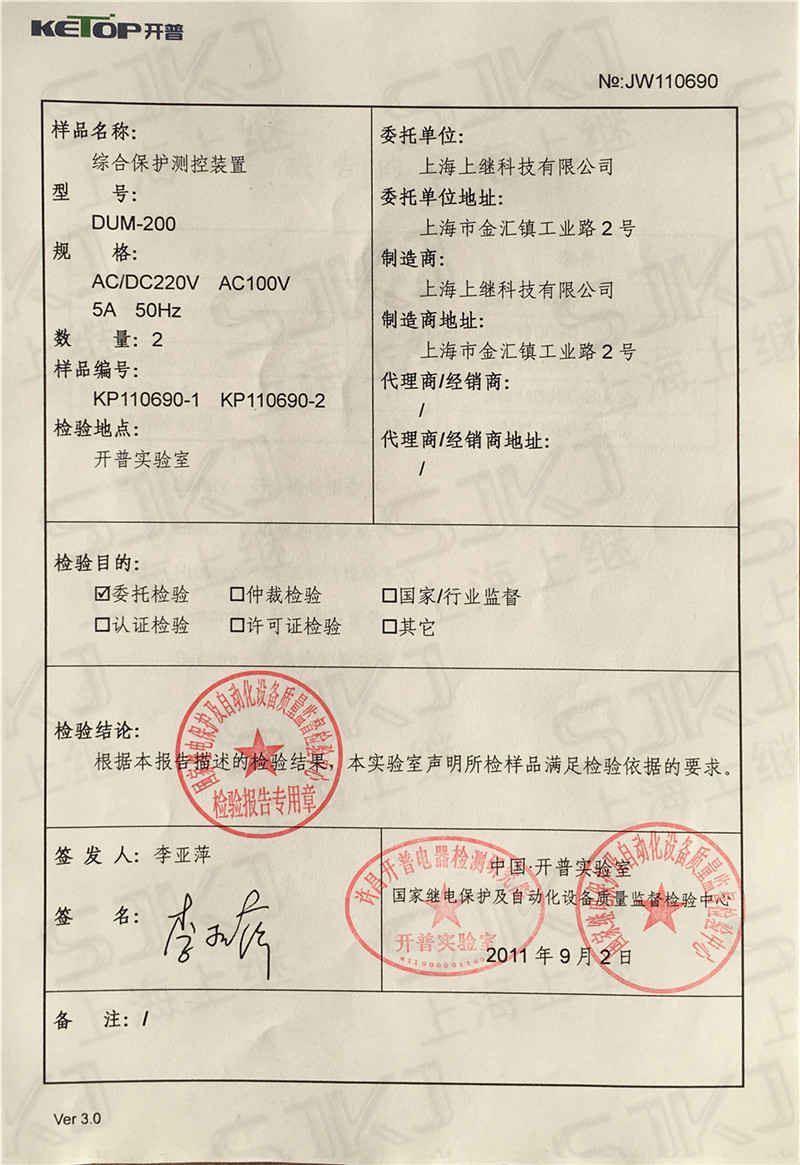您現在的位置: 首頁 >> 客戶服務 >> 資質證書 > DUM-200檢驗報告