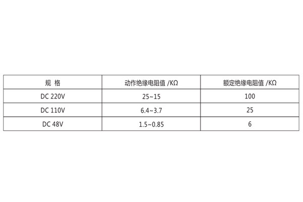 繼電器動作值:當母線任何一側對地絕緣電阻下降到下表規定值時.繼電器應可靠動作。